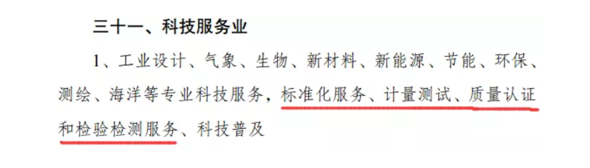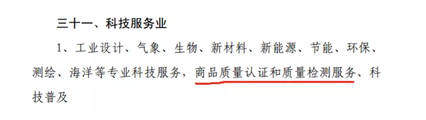認(rèn)證君查閱《產(chǎn)業(yè)結(jié)構(gòu)調(diào)整指導(dǎo)目錄(2019年本,征求意見稿)》全文,質(zhì)量認(rèn)證和檢驗檢測服務(wù)、標(biāo)準(zhǔn)化服務(wù)、計量測試等被列入鼓勵類第三十一大類科技服務(wù)業(yè)第一小類。截圖如下: