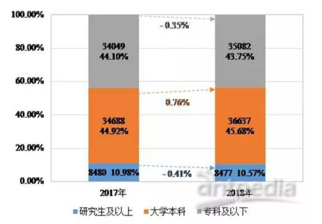 在學(xué)歷方面,具有大學(xué)本科以上學(xué)歷人員超半數(shù),其中研究生及以上學(xué)歷占比10.6%,大學(xué)本科占比45.7%,??萍耙韵聦W(xué)歷占比43.7%;在技術(shù)職稱方面,具有技術(shù)職稱人員超半數(shù),其中,高級技術(shù)職稱占比13.5%,中級技術(shù)職稱占比22.6%,初級技術(shù)職稱占比21.7%。