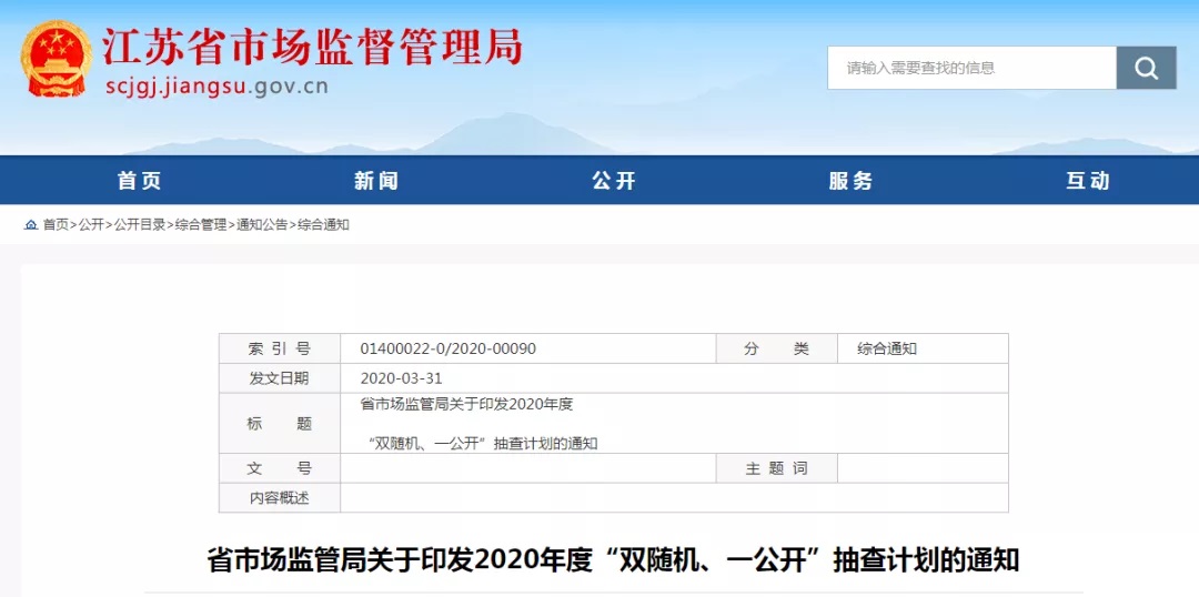 3月27日,江蘇省市場監(jiān)管局印發(fā)2020年度“雙隨機、一公開”抽查計劃,正式啟動年度“雙隨機、一公開”抽查工作。